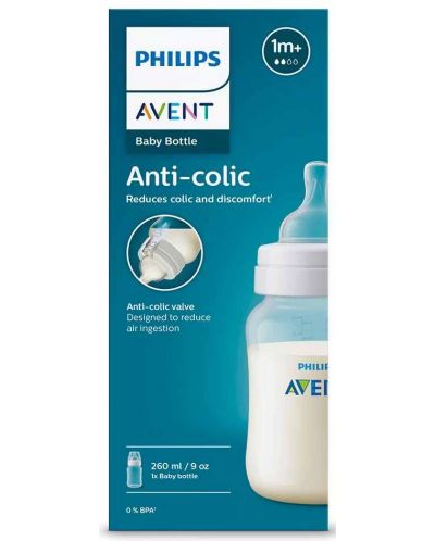 Avent анти-колик 260 мл. е предназначена за хранене на бебета и е оборудвана със специална анти-коликова система. Тази система помага да се намали количеството въздух, който попада в коремчето на бебето по време на хранене, което може да намали риска от колики и дискомфорт.