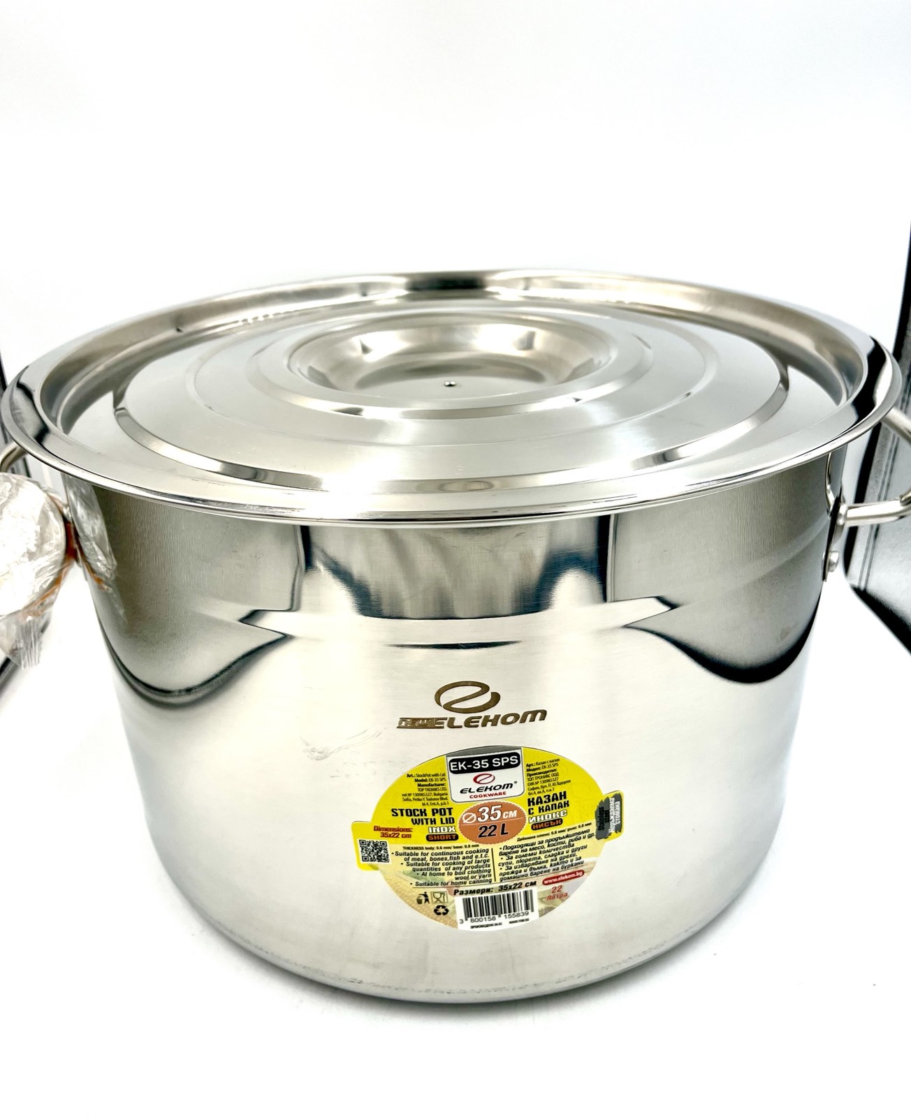 Казан Elekom EK-35SPS е голям и здрав готварски съд, изработен от качествена неръждаема стомана, с вместимост 22 литра и размери 35 см диаметър и 22 см височина. Подходящ е за приготвяне на големи количества супи, ястия и консерви, като осигурява равномерно разпределение на топлината и дълготрайна издръжливост.