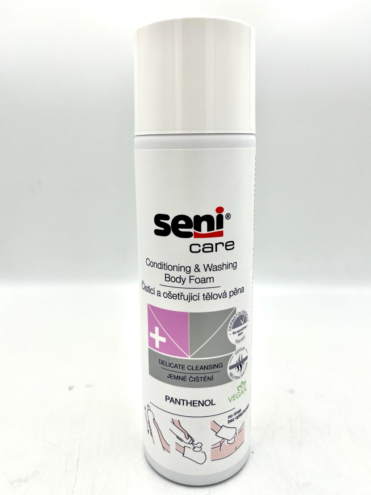 Пяна за тяло Seni Care 500 ml е нежна почистваща пяна за кожата на тялото, която ефективно и деликатно измива без нужда от вода, оставяйки защитен и успокоен кожен слой. Тя съдържа активни съставки като пантенол, зехтин и биокомплекс от ленено семе, които помагат за овлажняване, подхранване и намаляване на раздразнението на чувствителната кожа.