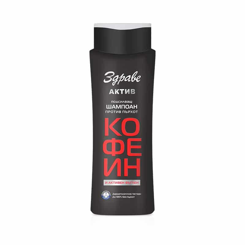 Шампоан Здраве против пърхот с кофеин и активен въглен с мощна формула. Уникалната комбинация от кофеин и активен въглен подсилва действието на три-активния комплекс в борба против пърхот. Той почиства скалпа и стимулира растежа на здрава коса. Кофеинът намалява загубата на коса, а активният въглен неутрализира неприятните миризми, причинени от развитието на микроорганизми по скалпа.