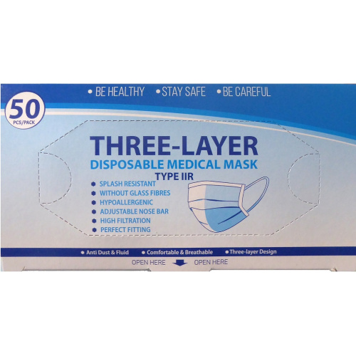 Трислойна медицинска маска с клипс и ластично пристягане. Първият слой е изработен от нетъкан полипропилен с фидрофобна обработка. Вторият е изграден от филтърен нетъкан текстил. Третият от нетъкан полипропилен. Маските гарантират отлична бактериална филтрация и устойчивост. Улавят всякакъв вид течност.