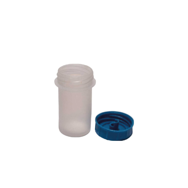 Контейнер стерилен, направен от нетоксична пластмаса. Малък и удобен за пренасяне и употреба. Затваря се безопасно с винтова капачка.
