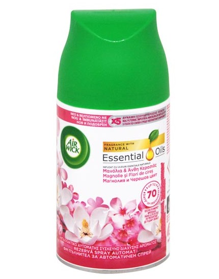 Аir Wick пълнител с аромат на магнолия, който разпръсква приятен, цветен аромат, вдъхновен от магнолии и черешов цвят, като създава уютна и отпускаща атмосфера у дома. Пълнителят е предназначен да се използва със съвместимо устройство, което автоматично освобождава аромата през определени интервали.