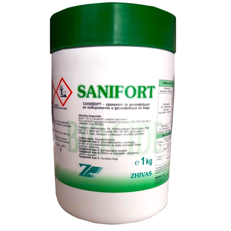 Санифорт - гранулат за дезинфекция на повърхности и дезинфекция на вода. Той е с бактерицидно, туберкулоцидно, вирусоцидно, фунгицидно, алгицидно и спороцидно действие.