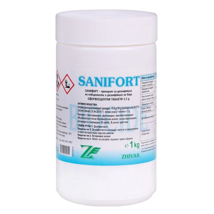 Санифорт - Препарат за дезинфекция на повърхности и дезинфекция на вода. Той има избелващ ефект. Оставя приятен мирис. Осигурява Бактерицидно, фунгицидно, микобактерицидно, алгицидно и спороцидно действие.