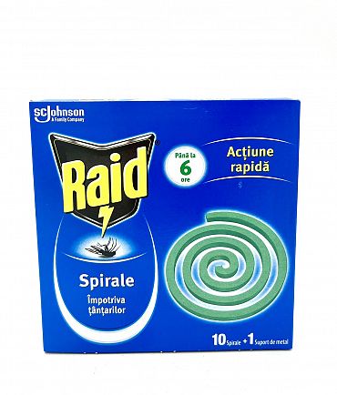 Raid спиралата, която епредназначена за отблъскване и убиване на комари и други летящи насекоми на открито. Тя е идеално решение за събития на открито, като градински партита, барбекюта, къмпингуване и други активности на открито, където комарите могат да бъдат проблем. Създава комфортна зона на открито.