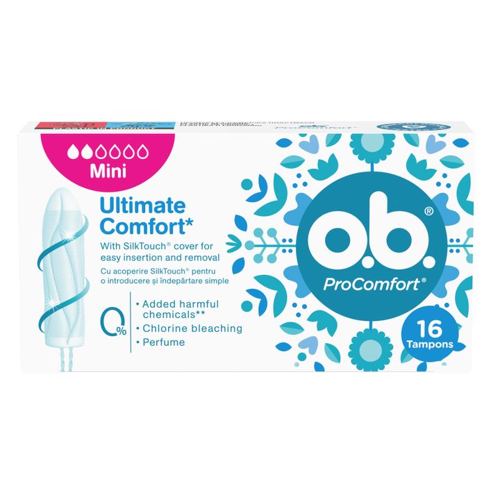 Тампони ob pro comfort mini се използват при слаба менструация. Тампоните доставят максимална защита, благодарение на спираловидните си каналчета. Тампоните са изключително малки, тънки и имат оформен връх за възможно най-лесно поставяне. Състоят се от Вискоза, полиетилен, полипропилен и полиестер.