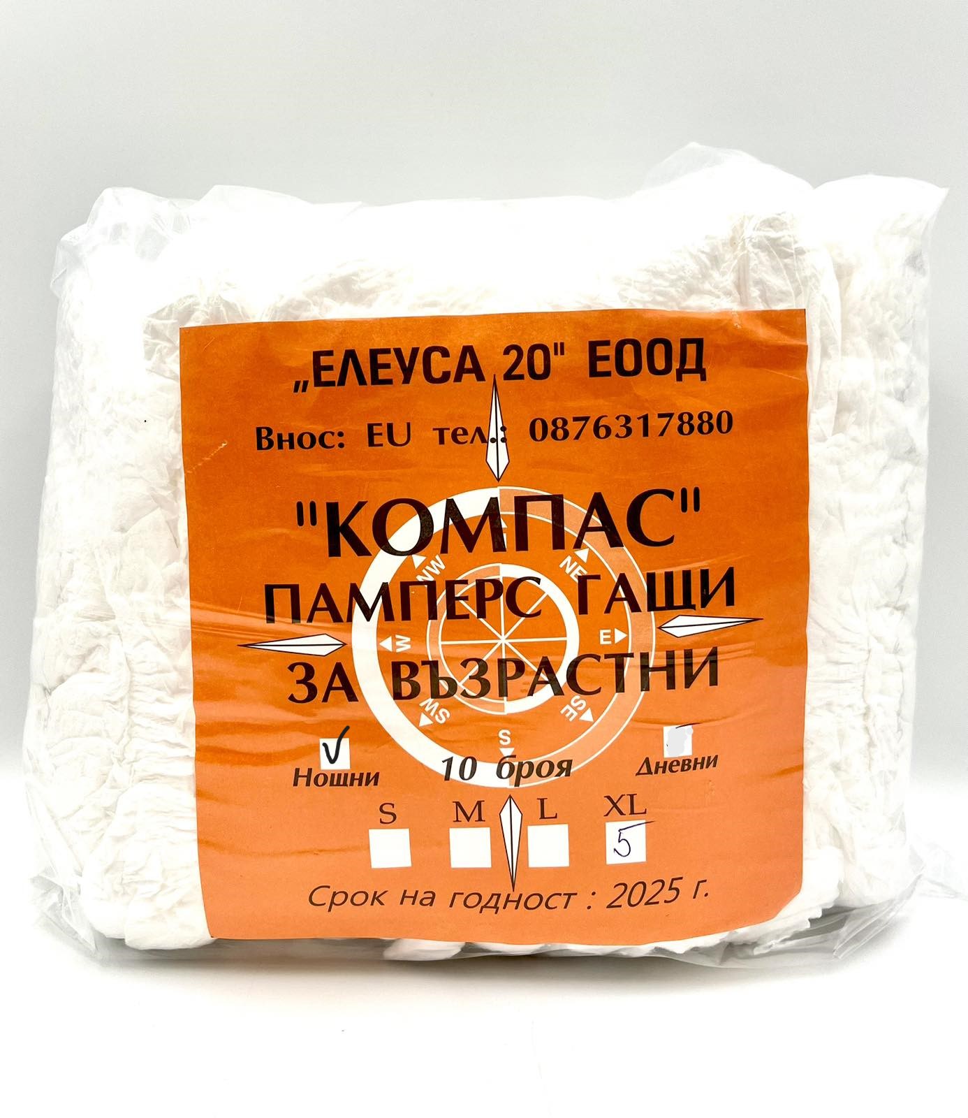 Гащи за възрастни компас, който са висококачествени европейски пелени, предназначени за възрастни хора, които имат нужда от тях. Снабдени са със специален индикатор, който показва нуждата от смяна. Осигуряват комфорт, поради високата им абсорбираща способност. Имат анатомична форма, мека еластична материя около бедрата, хартиени лепенки. Не съдържат латекс.
