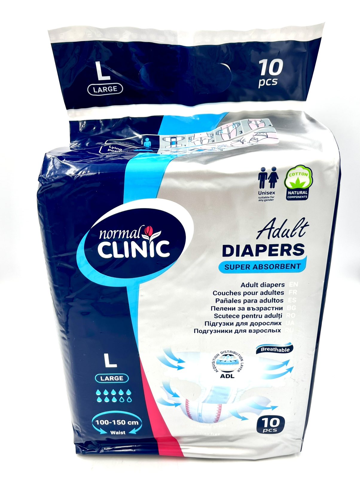 Пелените за възрастни Normal Clinic са хигиенни продукти, предназначени за хора, които имат нужда от помощ при контролиране на уринирането или изпражненията. Размер L е подходящ за хора с обиколка на талията от 100 до 150 см. Пелените осигуряват комфорт и защита, като помагат да се предотврати нежелано изпускане на течности и миризми.Те са подходящи за употреба при пациенти със сериозни или хронични здравословни проблеми, както и за хора в напреднала възраст, които имат нужда от допълнителна защита през деня и нощта.