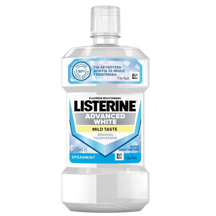 Вода за уста listerine, която унищожава бактериите до 99%. Тя премахва плаката, останала след почистването с четка. Не съдържа алкохол и остава приятен и дълготраен вкус.