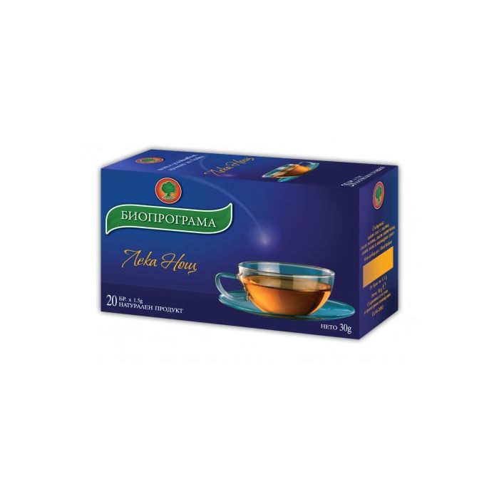 Чай Лека нощ има приятен вкус, аромат и успокояващо действие. Перфектна напитка, която да ви подейства отпускащо преди лягане. В чая има специално подбрани билки от екологично чисти райони. Състои се от: мента, маточина, цвят глог с листа, липа и хмел.