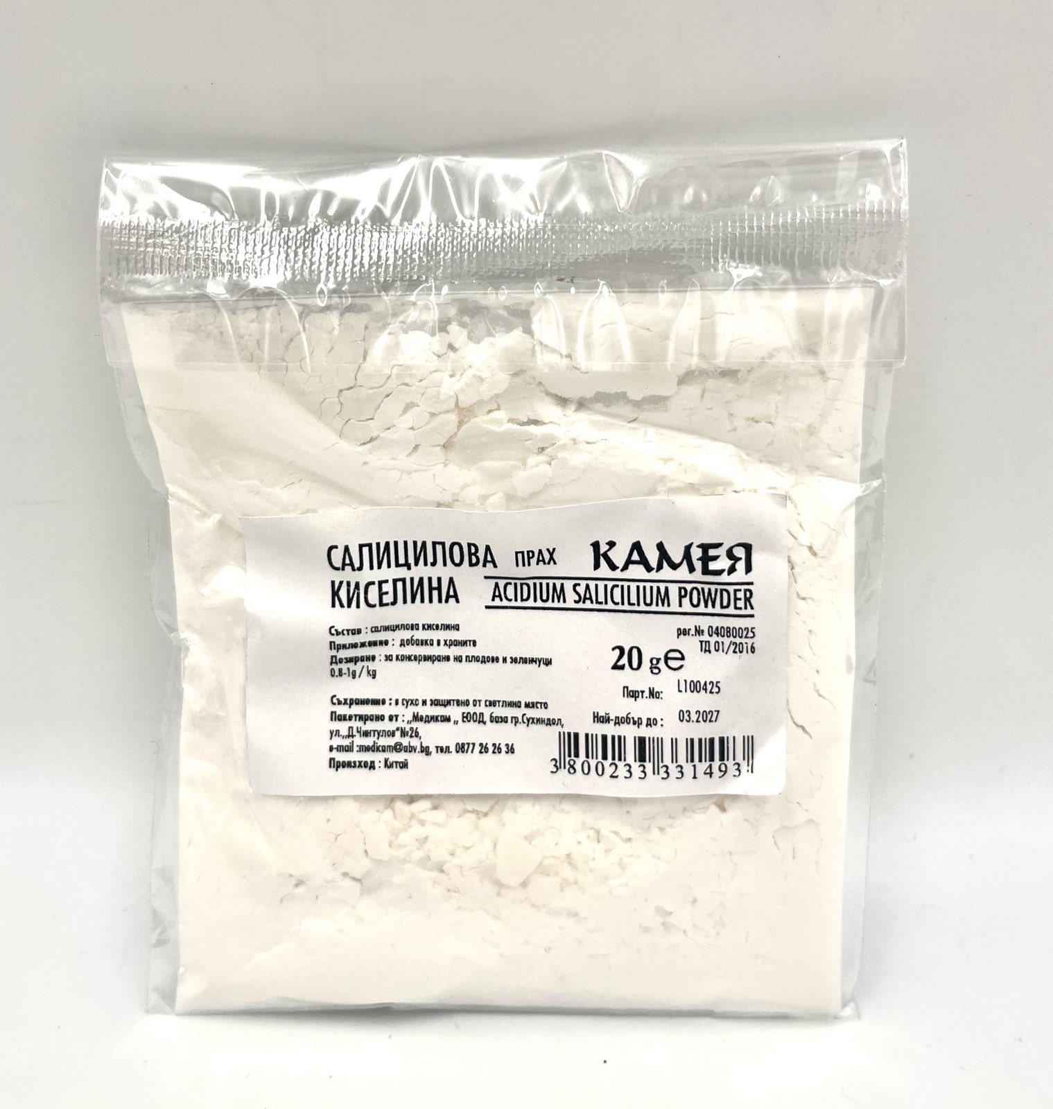 Салицилова киселина 20 гр, която се употребява за консервиране на плодове и зеленчуци.